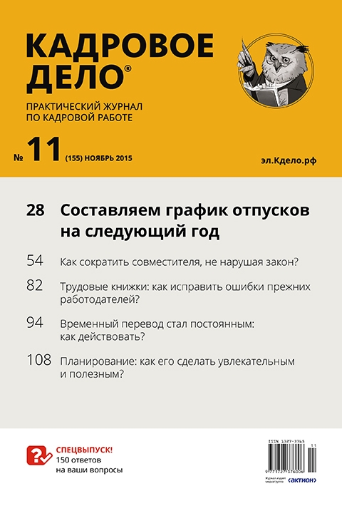 Ведущий кадровый журнал. Практическое издание о том, как применять нормы трудового права, оформлять кадровые документы, избегать трудовых споров и штрафов. В стоимость входят вебинары + приложения + кадровые консультации + доступ к сайту kdelo.ru.